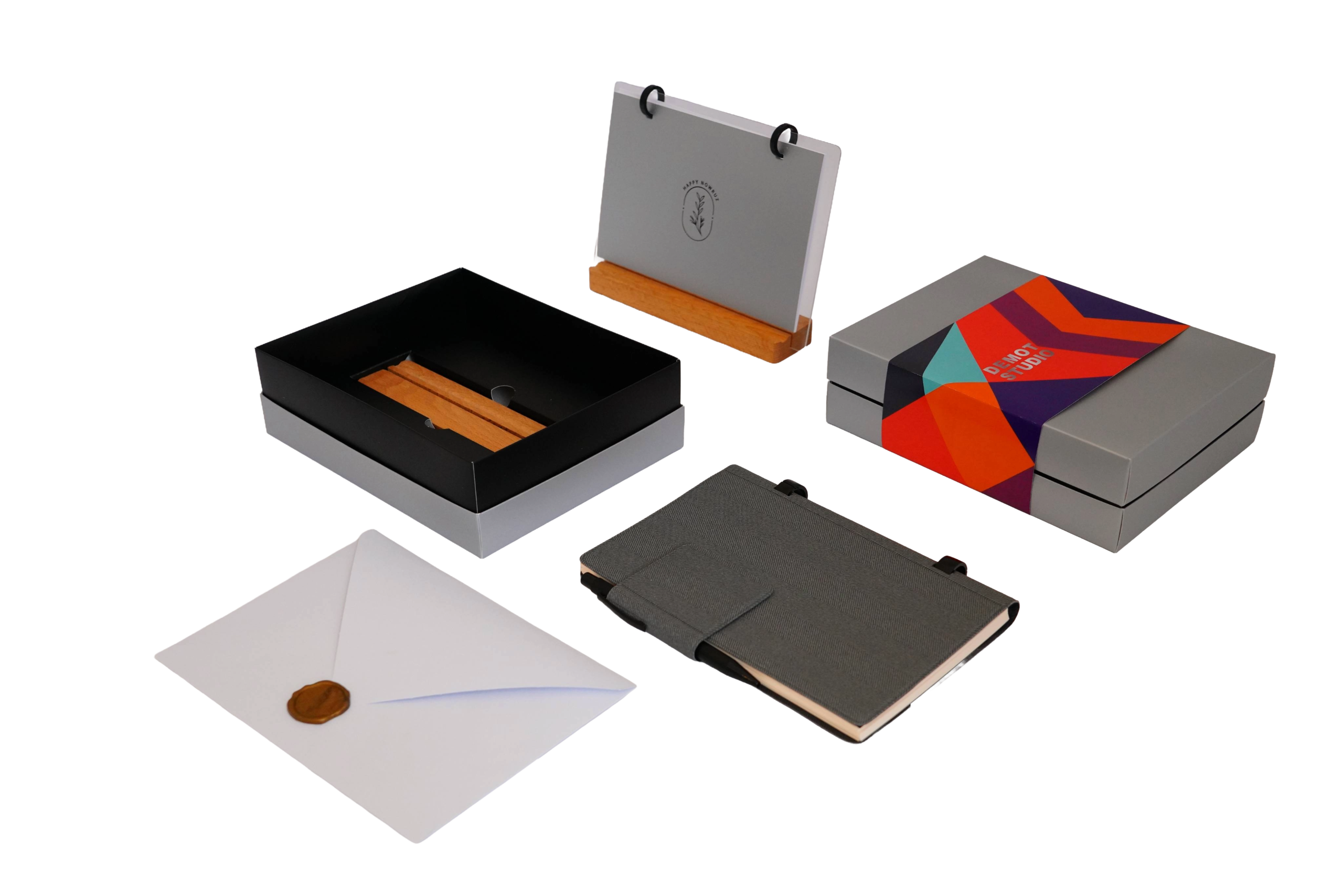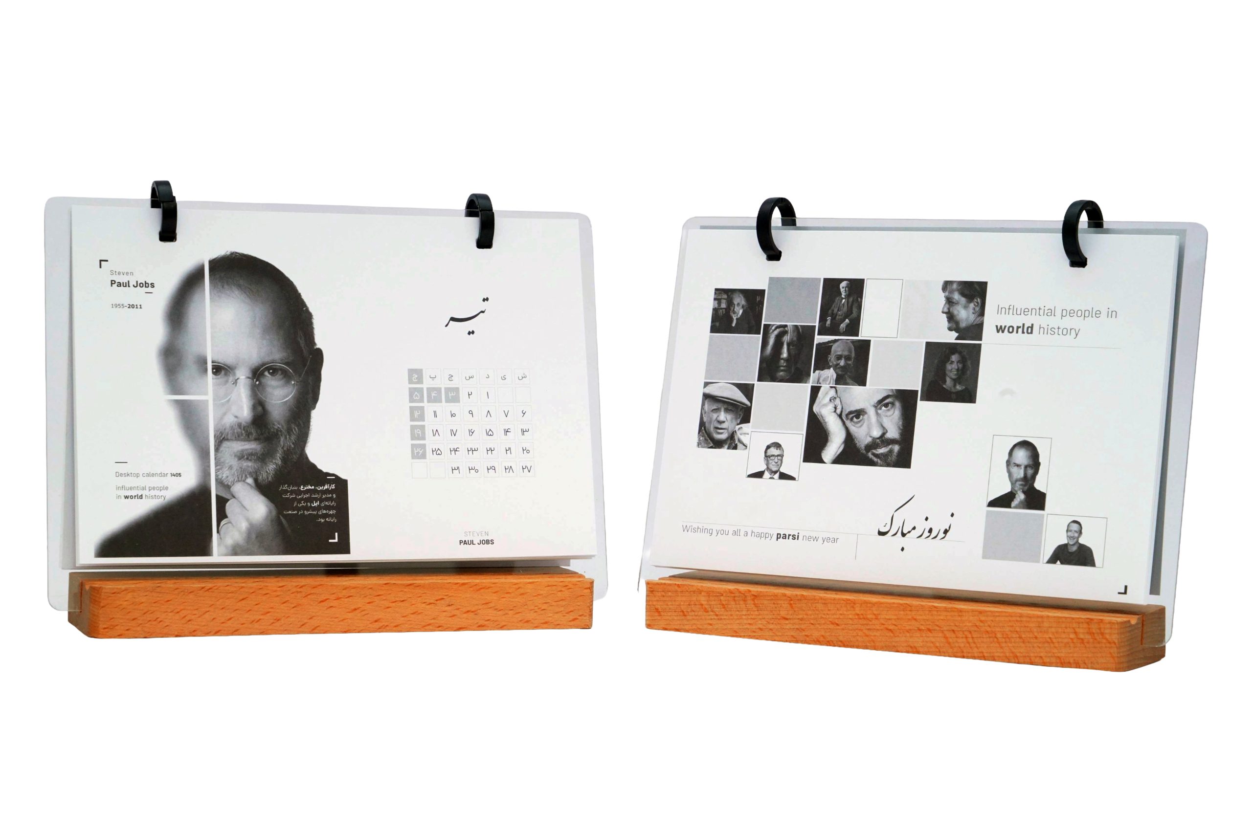 - تقویم رومیــزی طــرح قرمــز بــا صحافــی حلقــه ای گوشــواره ای بــا پلکســی و پایـه چـوب